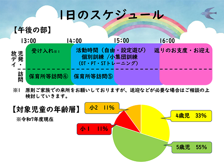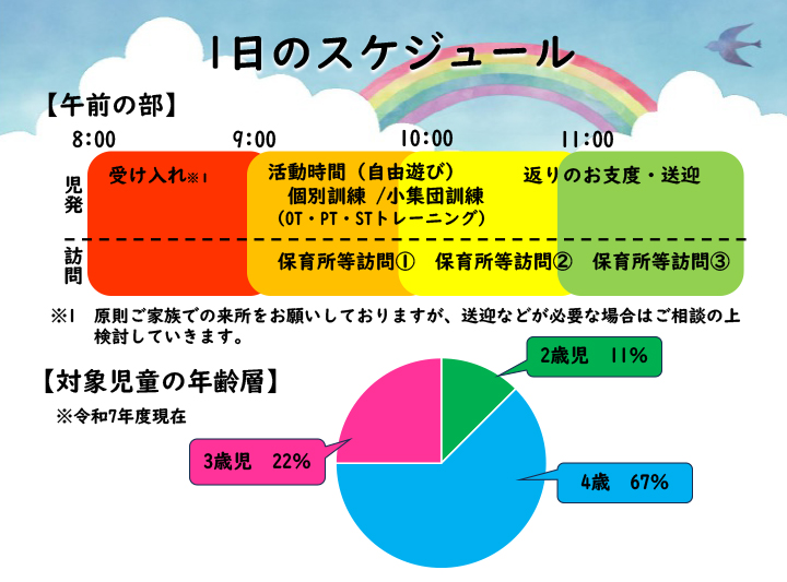 保育所等訪問事業・にじいろバナナでは、子どもたちが自身の生活の場で自分らしく成長を育めるよう、こども園や小学校などへ訪問し、訪問先スタッフへの助言や直接的な支援を行っています。また、医療・福祉・教育の場とご家庭の橋渡しを行い、子ども達に統一した関わりができるよう支援しています。